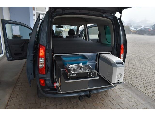 - Camping Modul M: Küchenauszug links mit Faltspüle und 10 L Frischwasserkanister mit Auslasshahn, Auszug rechts für optionale Kühlbox, 2 herausnehmbare Stauboxen ( 18 Liter und 27 Liter ),